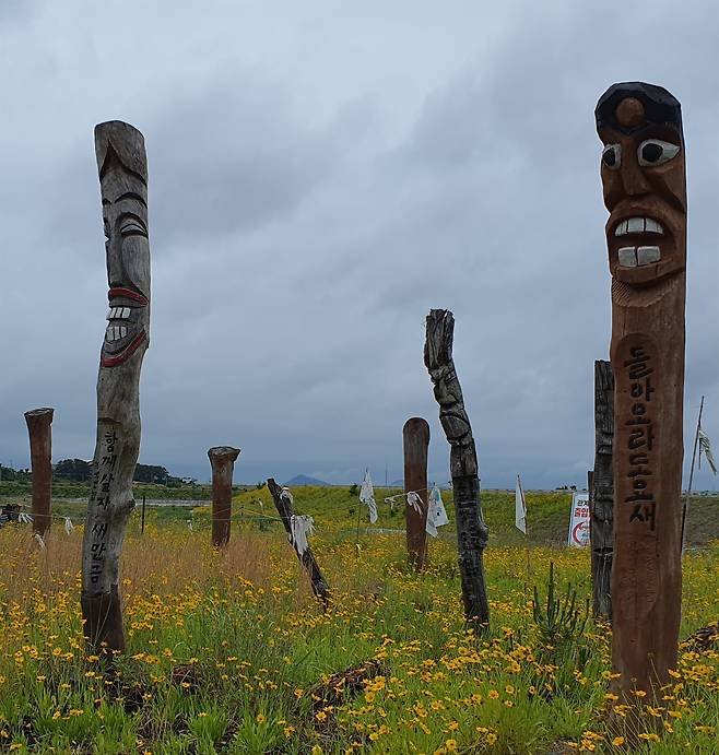 | ▲ ‘장승벌’이라고도 불리는 전북 부안군 해창 갯벌에 세워진 장승들. 해창 갯벌은 2003년 ‘새만금 갯벌 살리기’를 위해 온몸을 맨바닥에 붙이고 청와대까지 이어갔던 삼보일배의 출발지이기도 하다. |