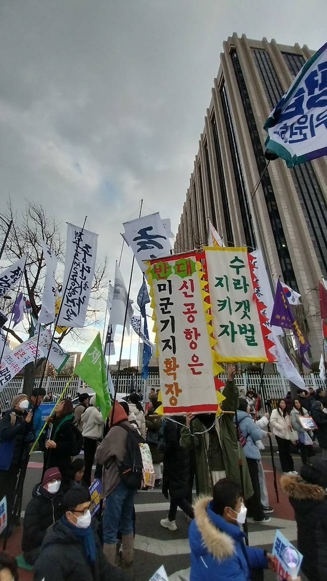 | ▲ 지난 1월 25일의 광장을 날던 ‘수라갯벌 지키자’, ‘신공항은 미군기지 확장’ 문구의 깃발들 |