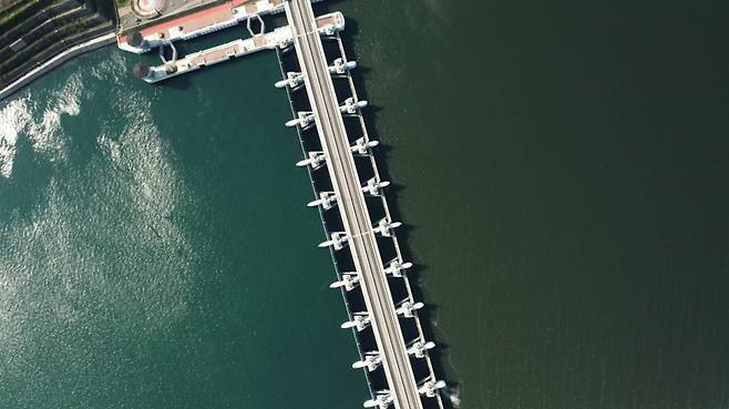 | ▲ 다큐멘터리 영화 <수라>(황윤 감독, 2023)의 장면. 방조제로 인해 바닷물(왼)과 담수호(오)가 분리되었다. 이후 급속도로 악화한 수질 문제를 알리고 개선하기 위해 새만금상시해수유통운동본부가 출범했다. |