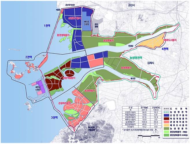 | ▲ 새만금 사업 용지의 계획도. 1권역의 ‘새만금신공항’ 자리에 현재 수라갯벌이 있다. |