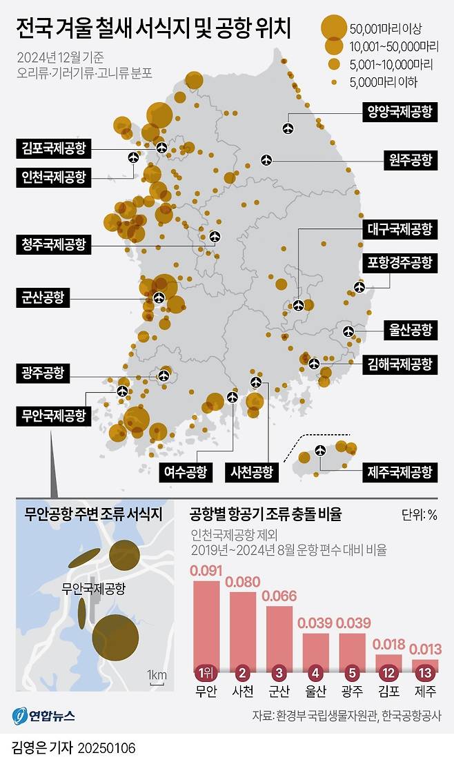 | ▲ 2024년 12월 기준, 전국 겨울 철새 서식지와 공항의 위치 |