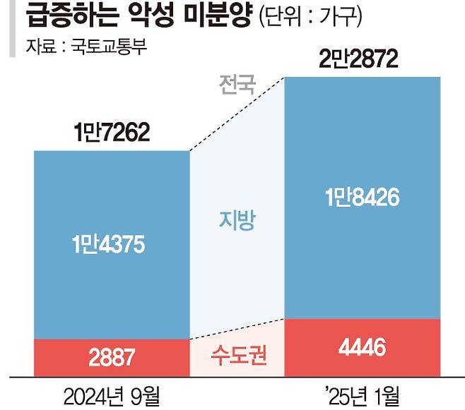 잔금 연체는 악성 미분양으로 연결되고 있다. 전국의 준공후 미분양 주택은 지난해 9월 1만7262가구에서 올 1월 2만2872가구로 32% 증가했다. 지방은 이 기간 1만4375가구에서 1만8426가구로 28% 늘었다. 수도권도 심상치 않다. 가구수는 상대적으로 적지만 증가율이 예사롭지 않기 때문이다. 지난해 9월 2887가구에서 올 1월에는 4446가구로 54% 늘었다. 인천은 이 기간 555가구에서 1707가구로 207% 폭증했다.