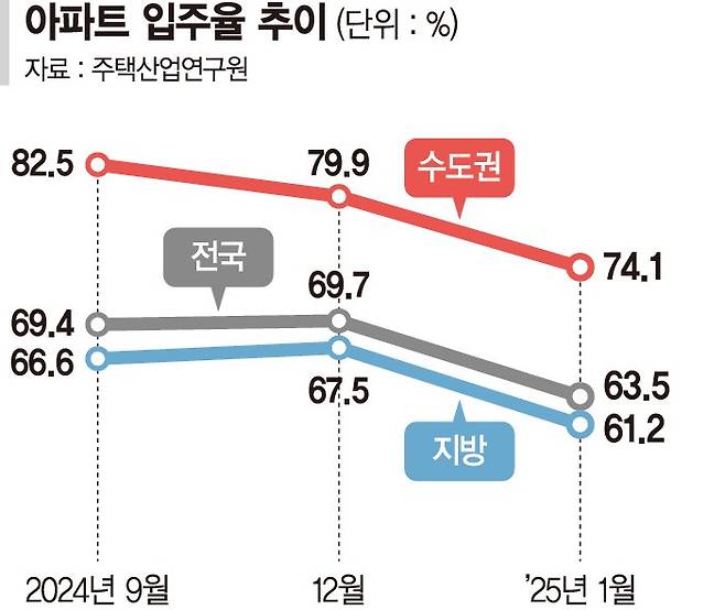 주택산업연구원에 따르면 전국 입주율은 2024년 9월 69.4%에서 올 1월에는 63.5%로 하락했다. 지방도 이 기간 66.6%에서 61.2%로 하락했다. 분양가가 높은 수도권은 사정이 더 심각하다. 82.5%였던 입주율이 올 1월에는 74.1%까지 떨어졌다. 노희순 주택산업연구원 연구위원은 "대출한도를 분기·월별을 넘어 일별로 관리하는 은행들이 늘어나고 있다"고 현재 상황을 전했다.