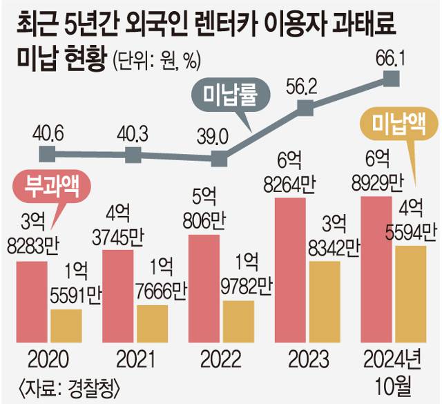 2020~2022년 40% 안팎이던 외국인 미납률은 지난해 10월 기준 66.1%까지 치솟았다. 5년간 평균 미납률은 50.7%에 달했다. 같은 기간 내국인 렌터카 이용자의 과태료 미납률 평균(25.8%)보다 2배 가까이 높았다.