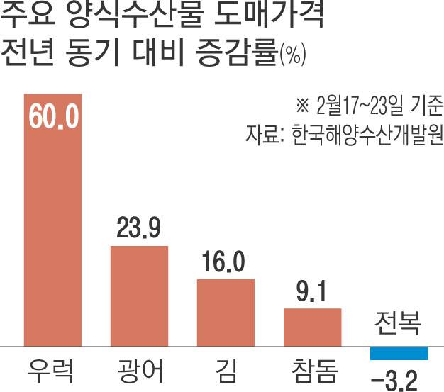 반면 전복(1㎏)의 2월 셋째주 평균 도매가격은 3만500원으로 지난해(3만1500원)보다 3.2% 떨어졌다. 과잉 생산과 국내 경기 악화에 따른 소비 부진 영향으로 가격이 하락한 것으로 풀이된다.
