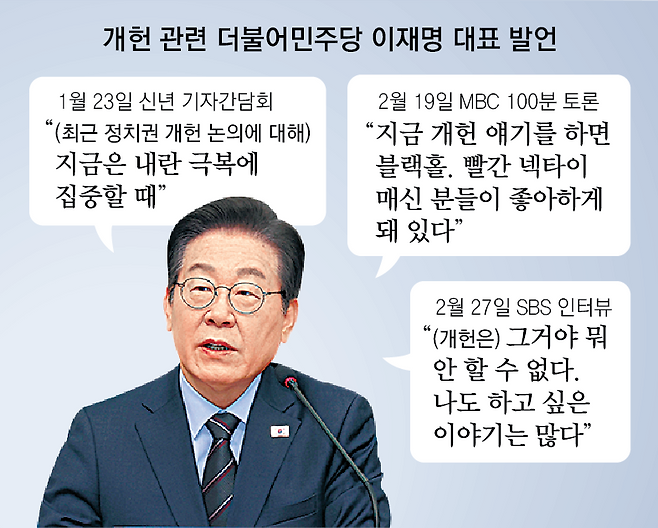 이 대표도 지난달 27일 “개헌 논쟁이 블랙홀이기 때문에 지금은 내란 극복에 집중한다는 것”이라고 밝히는 등 개헌에 대해 신중한 입장을 이어가고 있다. 친명계 중진 의원은 임기 단축 개헌론에 대해 “차기 대통령 임기를 3년으로 단축하면 3년 동안 차기 대통령은 아무것도 못 한다”면서 “집권 1년 뒤에 지방선거 치르고, 그다음에 총선 있는데 무슨 일을 할 수 있겠느냐”고 회의적인 반응을 보였다.