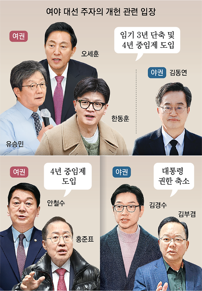 여권 대선 주자들은 개헌 논의에 더 적극적이다. 오세훈 서울시장과 국민의힘 한동훈 전 대표, 유승민 전 의원 등은 임기 단축 개헌론을 주장하고 있다. 차기 대통령이 다음 총선(2028년)에 맞춰 임기를 3년으로 줄이되 4년 중임제를 담은 개헌안 국민투표를 총선, 대선과 함께 실시하자는 것. 홍준표 대구시장, 안철수 의원은 4년 중임제 개헌에 찬성하고 있다.
