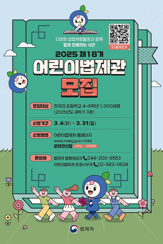 [서울=뉴시스] 남정현 기자 = 법제처가 31일까지 어린이법제관(4~6학년 초등학생 대상)과 청소년법제관(중·고등학생 및 학교 밖 청소년 대상)을 모집한다고 4일 밝혔다.