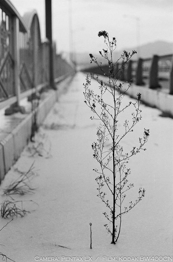 | ▲ 꼿꼿하게 신학리와 금강리를 연결하는 다리 위. 다년살이 풀인지, 겨울의 풍파에도 힘을 잃지 않고 서 있다. |