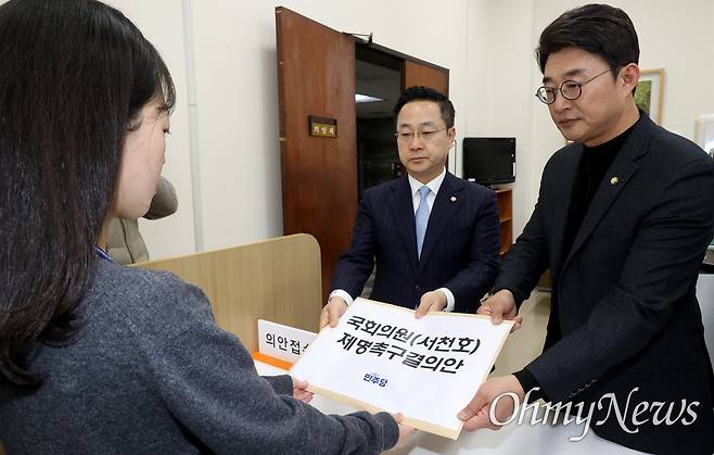 | ▲ 민주당, 서천호 제명 촉구 결의안 제출 더불어민주당 박성준(서울 중구성동구을), 노종면(인천 부평구갑) 의원이 4일 오후 서울 여의도 국회 의안과에서 서천호(경남 사천시남해군하동군) 국민의힘 의원 제명 촉구 결의안 및 징계요구안을 제출하고 있다. 서천호 국민의힘 의원은 지난 3·1절 윤석열 대통령 탄핵 반대 집회에서 연단에 나와 “헌법재판소를 때려 부숴야 한다”라고 주장했다. |