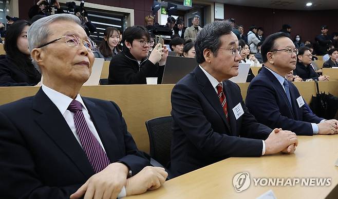 (서울=연합뉴스) 이진욱 기자 = 4일 서울대 아시아연구소에서 열린 국가미래전략원 정치개혁 대담회 '국가원로들, 개헌을 말하다'에 김종인 전 국민의힘 비상대책위원장(왼쪽부터), 이낙연, 김부겸 전 총리가 참석해 있다. 2025.3.4