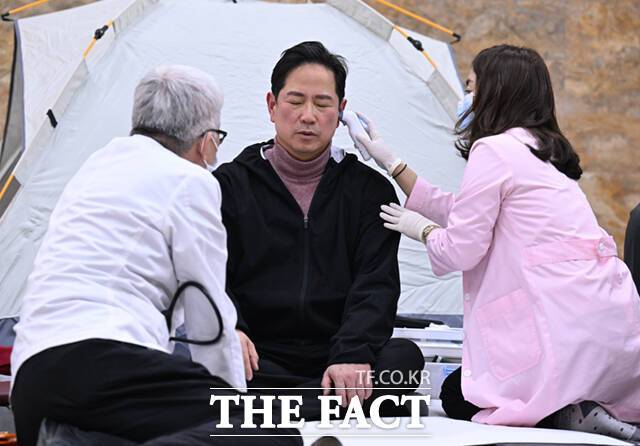 [더팩트ㅣ국회=이새롬 기자] 마은혁 헌법재판관 추가 임명에 반대하며 단식농성에 돌입한 박수영 국민의힘 의원이 4일 서울 여의도 국회 로텐더홀에 마련된 농성장에서 혈압 체크를 받으며 두통을 호소하고 있다.