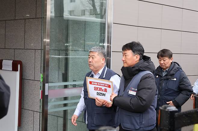 | ▲ 양대노총 위원장들이 윤 대통령의 즉각파면을 촉구하는 의견서를 제출하기 위해 헌법재판소로 들어서고 있다. |