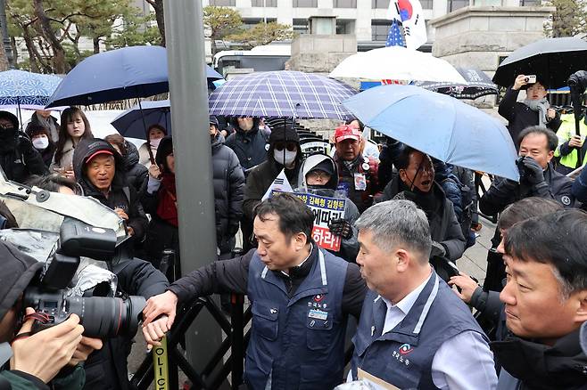 | ▲ 한편 같은 날 헌법재판소 앞에서 윤 대통령의 탄핵을 반대하고 헌법재판관을 규탄하는 극우 세력들이 의견서를 제출하러 이동하는 양대노총 위원장들에게 몰려와 폭언과 가짜뉴스 선동 등을 저질렀다. |