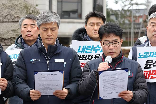 | ▲ 양대노총은 기자회견을 통해 반노동 정책과 노동 탄압을 일관했던 윤석열 대통령의 파면을 촉구하는 내용이 담긴 의견서를 낭독했다. |