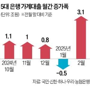 지난달 가계대출 증가를 이끈 것은 주택담보대출이다. 5대 은행의 주담대 잔액은 2월 한 달 동안 3조3835억원(0.6%) 늘었다. 주담대 월간 증가폭은 작년 10월부터 올해 1월까지 줄곧 1조~1조5000억원 수준에 머물렀지만, 지난달 큰 폭으로 반등했다.