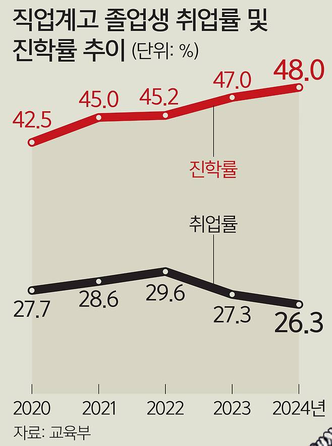 반면 지난해 직업계고 졸업생의 취업률은 관련 통계 작성 이후 가장 낮았다. 지난해 졸업자 중 취업자 비율은 26.3%로 2020년 이후 가장 낮은 수치였다. 졸업생 중 대학에 진학하거나 입대한 사람을 제외하고 계산한 취업률은 55.3%로 전년 동기(55.7%) 대비 0.4%포인트 하락했다.