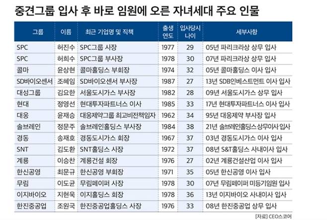 입사 후 바로 임원에 오른 중견그룹 주요 오너일가로는 김영민 SCG 회장, 현정은 현대그룹 회장, 허진수 SPC그룹 사장, 허희수 SPC그룹 부사장 등이 있다.