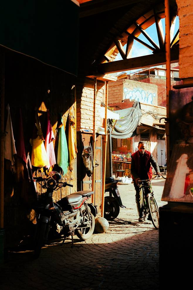 모자이크 타일에 비친 태양의 움직임과 가죽 시장 염색공의 물든 점퍼.