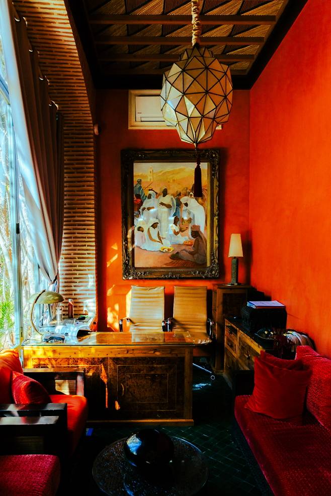 들어서면 수초, 수련, 파피루스가 심어진 정원과 연못이 나타난다. 야자수가 드리워진 아담한 수영장도 있다. 어쩐지 옛 마라케시 왕족의 별장에 몰래 들어 온 기분이랄까. 강렬한 붉은색 벽지로 장식된 리셉션에서조차 오랜 시간 축적된, 앤티크한 우아함이 느껴진다.