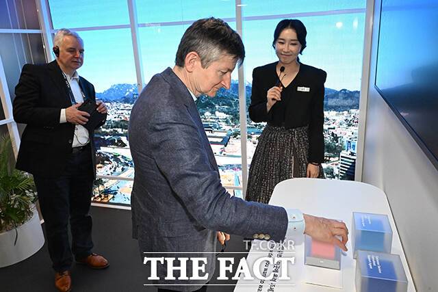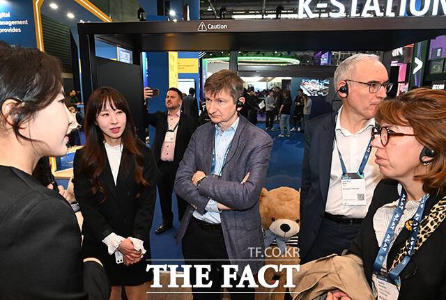 [더팩트ㅣ사진공동취재단] 브누아 톨로팅 프랑스 통신사 부이그텔레콤(Bouygues Telecom) 대표가 4일(현지시간) 스페인 바르셀로나 피라 그란 비아 전시장에서 열린 '모바일 월드 콩그레스(MWC) 2025' KT 부스를 둘러보고 있다.