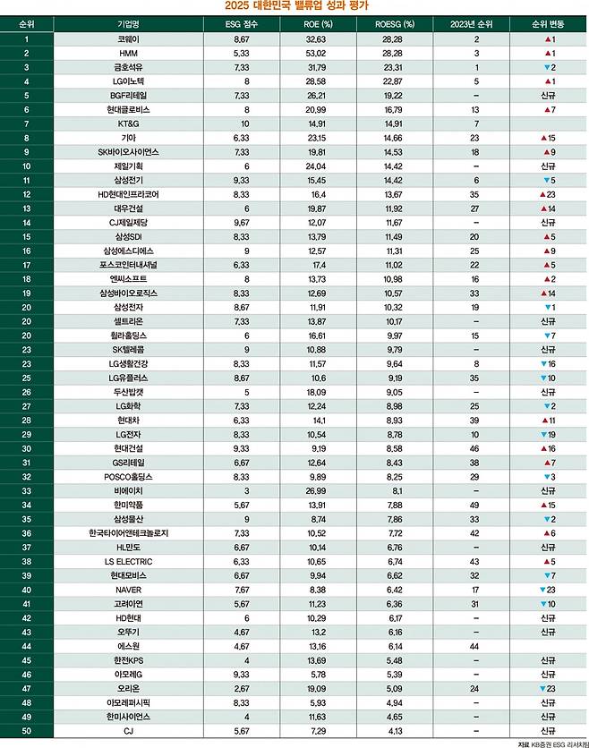 지난해 밸류업 성과 결과를 보면 코웨이, HMM 같은 기업은 높은 ROE를 유지하면서도 ESG 점수가 상대적으로 높았다. 이 중 코웨이는 높은 ESG 점수 덕분에 지속가능 경영 측면에서도 우수한 평가를 받았다.
