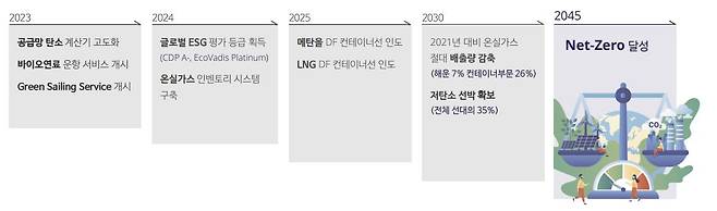 HMM은 2045년까지 탄소중립 목표를 달성하기 위해 친환경 전략을 강화하고 있다. 오는 2030년까지 14조4000억 원을 투자해 저탄소 및 친환경 선박 확보에 나서는 한편 LNG 및 메탄올 이중 연료(DF) 컨테이너선 도입을 확대하고, 탄소배출 저감을 위한 운항 효율 개선 기술을 도입할 예정이다. 또 ‘Green Horizon’, ‘Green Movement’, ‘Green Management’를 중점 추진 과제로 설정해 친환경 물류 확대 및 지속가능한 해운 생태계 구축을 목표로 하고 있다.