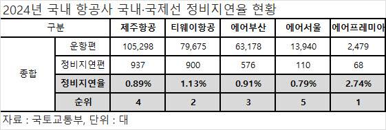 최근 잇따른 사고로 항공 안전에 대한 경각심이 고조된 가운데 지난해 기준 항공기 정비 문제에 따른 지연율이 가장 높은 항공사는 에어프레미아인 것으로 조사됐다.
