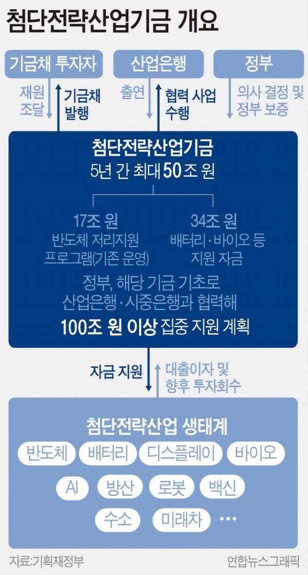 이에 따라 정부는 산업은행에 5년간 최대 50조 원의 첨단전략산업기금을 신설하기로 했다.