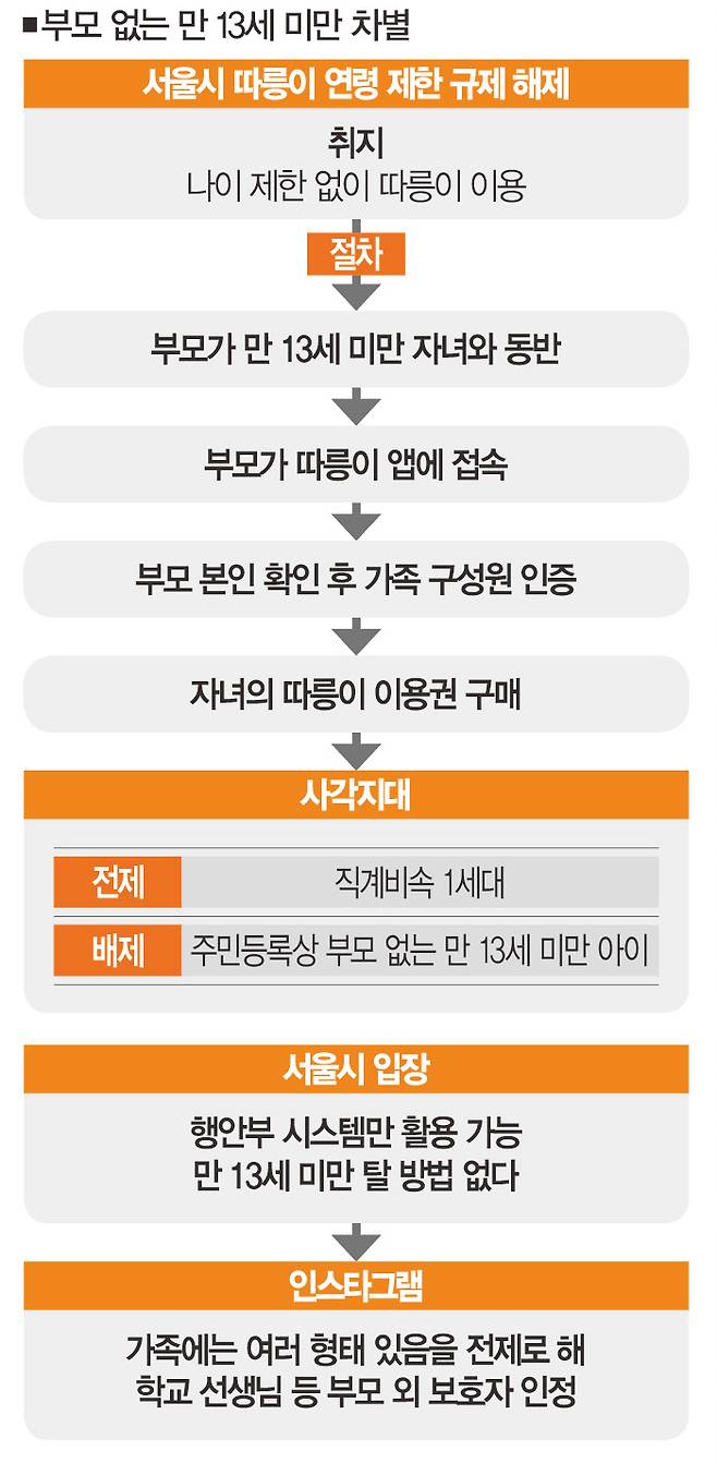 ■ 그림자❷ 시스템 문제 = 우려는 이뿐만이 아니다. '부모 없는 아이들'을 배려하지 않았다는 지적도 나온다. 서울시가 도입할 예정인 '따릉이 가족권'은 행정안전부 행정정보공동이용시스템을 활용한다.