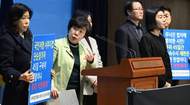조배숙 국민의힘 의원이 5일 국회 소통관에서 서부지법 사태 경찰의 토끼몰이 함정단속 고발 및 국민저항 단순참가자 무죄 석방 촉구 기자회견을 하고 있다. 오승현 기자 2025.03.05
