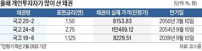 장외 채권시장에서 개인이 가장 많이 산 채권은 ‘국고01500-5003(20-2)’이었다. 2020년 연 1.5% 금리로 발행된 30년 만기 저쿠폰채다. 이 밖에 표면 금리가 연 2.75%인 국고(24-8)와 연 1.125%인 국고(19-06)도 순매수 상위권에 이름을 올렸다.