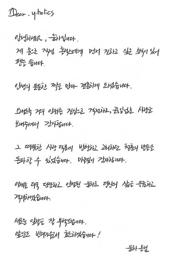 5일 윤하는 공식 팬카페를 통해 직접 자필로 결혼을 발표했다.