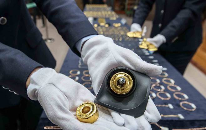 5일 인천시 중구 인천공항세관 수출입통관청사에서 관세청 관계자가 금 밀수 단속 내용을 브리핑하는 가운데 밀반입된 금을 보이고 있다.