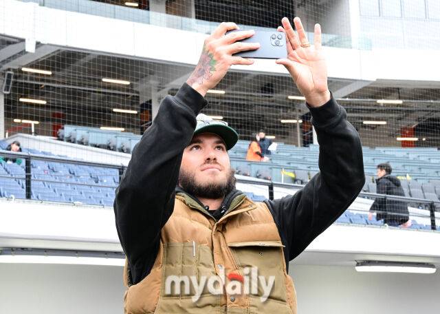 [마이데일리 = 한혁승 기자] 5일 대전 한화생명 볼파크 야구장 개장식이 열렸다. 한화 외국인선수 코디 폰세가 핸드폰으로 경기장을 촬영하고 있다.