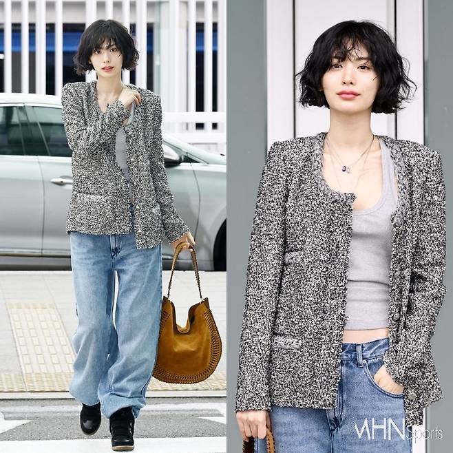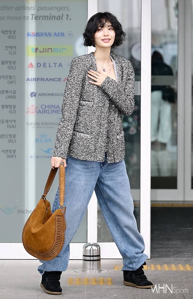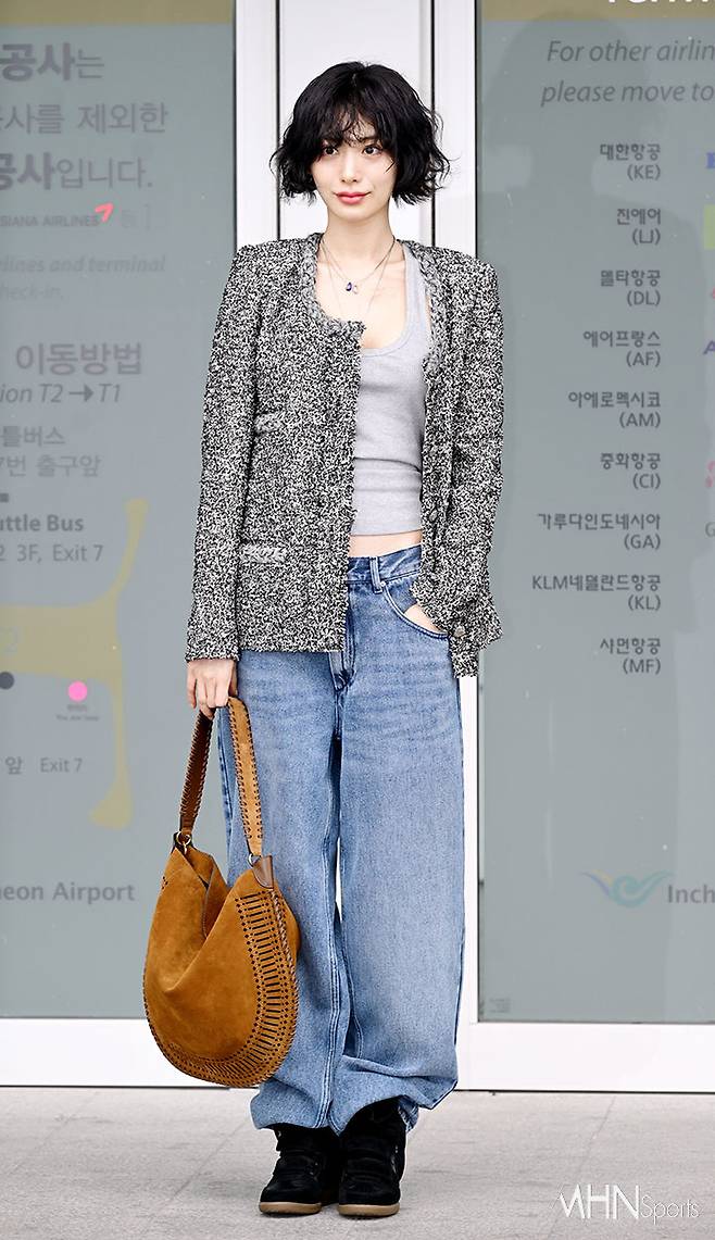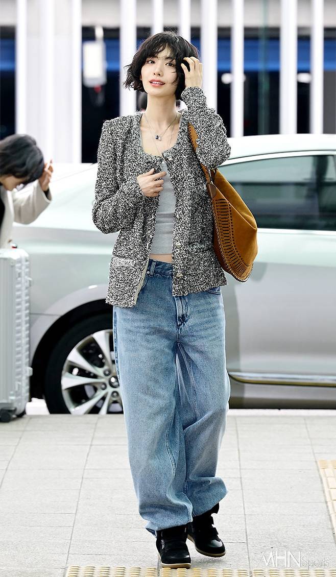 이날 나나는 그레이 컬러 슬리브리스톱과 빈티지한 무드의 와이드 데님 팬츠를 매치해 편안한 무드를 연출했다. 여기에 트위드 소재의 재킷을 더해 캐주얼한 룩에 우아함을 더한 공항패션을 선보였다.