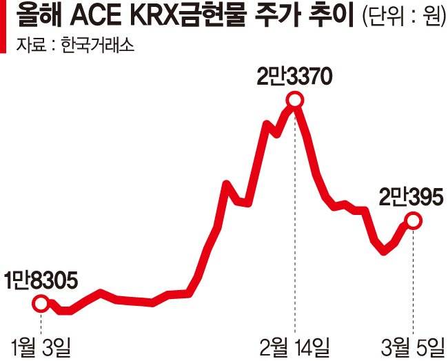 국내 금 가격이 국제 금 시세 수준으로 내려앉는 동안 국내 개인 투자자들은 오히려 금 관련 ETF를 사모은 것으로 나타났다. 국내 금값이 역대 최고치를 경신한 지난달 14일부터 지난 4일까지 개인 투자자들은 금 현물에 투자하는 'ACE KRX금현물'을 898억원어치 순매수했다. 국내 금값이 24.3% 급등했던 직전 한 달(1월 13일~2월13일) 872억원어치를 순매수했던 것보다도 많은 금액이다.
