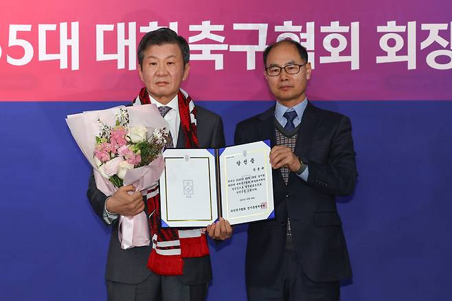 지난 2월 26일 서울시 종로구 축구회관에서 열린 제55대 대한축구협회장 선거에서 정몽규 회장은 1차 투표에서 총 유효투표 182표 중 156표를 얻어 결선 투표 없이 당선됐다. 당시 신문선 명지대 초빙교수, 허정무 전 국가대표팀 감독 등이 '정몽규 타도'를 외치며 출마했지만 압도적으로 표 수에서 밀렸다.