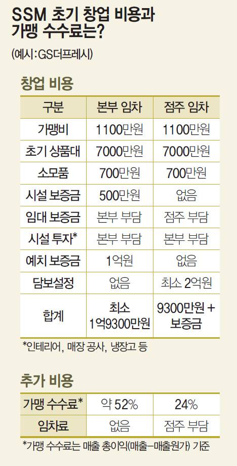 ‘본부 임차’는 초기 투자비가 9300만원이다. 가맹비 1100만원(부가세 포함)에 초기 상품대가 7000만원, 여기에 소모품(700만원)과 시설보증금(500만원)을 더한 액수다. 이 밖에 냉장고나 냉동고 같은 각종 설비, 인테리어 비용과 실내 공사 등은 모두 본부가 부담한다. 계약 종료 시 돌려받을 수 있는 예치보증금 1억원을 포함하면, 현금 1억9300만원이 있으면 SSM 창업에 도전할 수 있다.