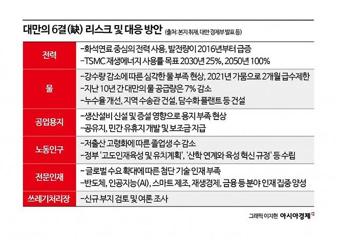 글로벌 무역전쟁에 대비하는 대만 TSMC의 최대 리스크로는 6가지 부족, 이른바 '6결(缺)' 문제가 꼽힌다. 전력이나 공업용수, 용지 부족 등 쉽게 극복하기 힘든 지정학적 한계가 대부분이다. 특히 최근 대만 정부가 재정건전성을 이유로 예산안에서 대규모 전력 공사 보조금을 삭감하면서 첨단설비를 확대하려는 반도체 기업들의 전략에도 제동이 걸릴 가능성이 커졌다. 미·중 경쟁 구도와 국가 간 미래 핵심기술 확보 경쟁이 심화하는 상황에서 '파운드리 1위'의 위상이 만성적 자원 부족으로 흔들릴 처지에 놓인 것이다.
