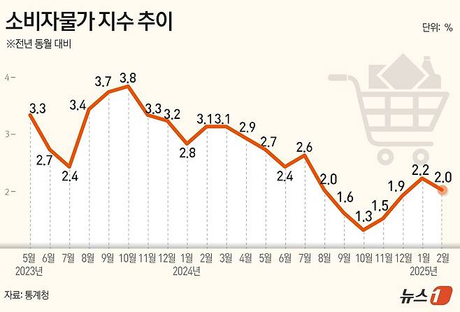 (서울=뉴스1) 김초희 디자이너 = 통계청이 6일 발표한 '2025년 2월 소비자물가동향'에 따르면 지난달 소비자물가지수는 116.08(2020=100)로 전년 동월 대비 2.0% 상승했다. 올해 1월 2.2%로 2%대에 재진입한 데 이어 2월에도 2%대(2.0%) 상승률을 이어갔다.