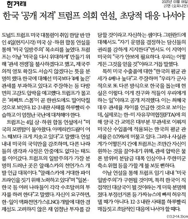 한겨레 = 한국 '공개 저격' 트럼프 의회 연설, 초당적 대응 나서야