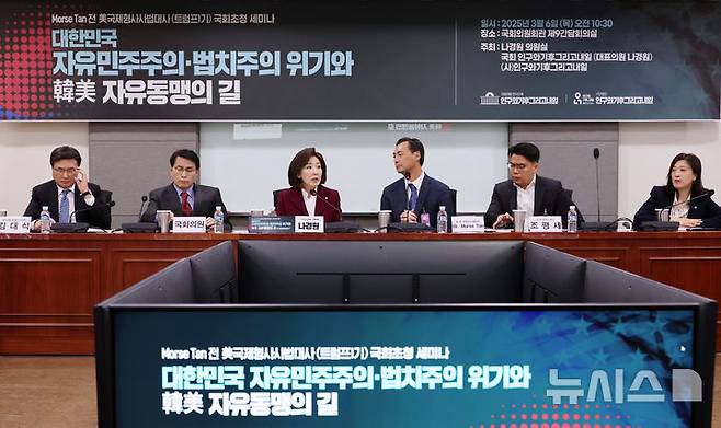 [서울=뉴시스] 조성우 기자 = 나경원(왼쪽 세 번째) 국민의힘 의원이 6일 오전 서울 여의도 국회 의원회관에서 열린 대한민국 자유민주주의·법치주의 위기와 한미 자유동맹의 길 : 모스 탄 전 미국 국제형사사법 대사 초청 세미나에서 발언하고 있다. 왼쪽부터 김대식, 윤상현, 나경원 의원, 모스 탄 전 대사, 조평세 1776 연구소 박사, 최보윤 의원. 2025.03.06. xconfind@newsis.com
