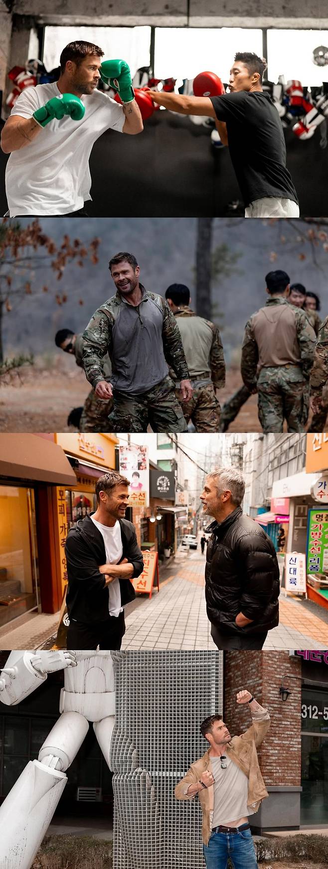 공개된 사진 속 크리스 헴스워스는 군복을 입고 있는가하면, 김동현과 체육관에서 글로브를 끼고 격투를 벌이고 있어 눈길을 끈다.