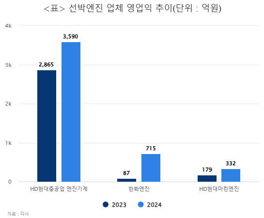 연이은 수주에 선박엔진 업체들의 실적은 고공행진하고 있다. HD현대중공업 엔진기계 사업부의 지난해 영업이익은 3590억원으로 전년(2865억원) 대비 25.3% 증가했다. 같은 기간 한화엔진, HD현대마린엔진 영업이익은 719.5%, 85.2% 늘어난 715억원, 332억원을 달성했다.