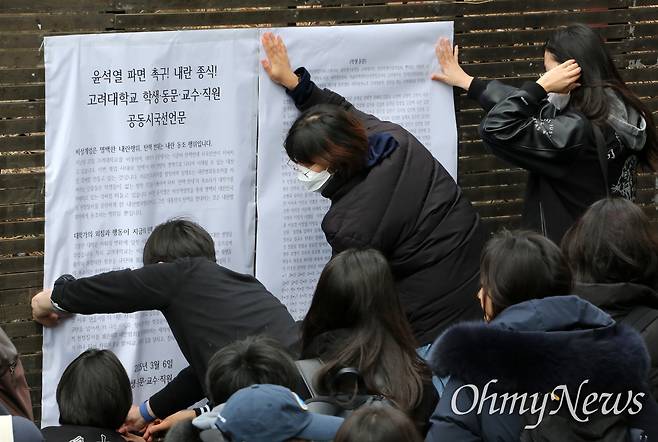 | ▲ 윤석열 파면 촉구! 내란 종식! 고려대 학생, 동문, 교수, 직원 공동시국선언 고려대학교 재학생, 동문, 교수, 직원들이 6일 오후 서울 성북구 고려대 중앙광장에서 '윤석열 파면 촉구! 내란 종식! 고려대학교 학생, 동문, 교수, 직원 공동시국선언'을 마친 뒤 정경대 후문 게시판에 시국선언문을 부착하고 있다. |