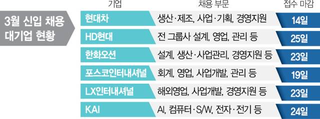 한화오션(042660)은 지난달 28일부터 올해 상반기 신입사원 공개채용 절차를 시작했다고 6일 밝혔다. 설계와 사업 관리를 중심으로 한 일반 공채에 더해 스마트 조선소 운용의 핵심 인력이 될 생산직 인력 채용도 진행하고 있다. 생산직들은 경남 거제조선소 상선·해양·특수선 분야의 주요 공정에 투입될 예정이다. HD현대그룹도 4일부터 신입사원 모집에 나섰다. 조선 부문(HD한국조선해양(009540)·HD현대중공업(329180)·HD현대미포(010620)·HD현대삼호)과 HD현대마린솔루션(443060) 등 전 그룹사가 동시에 직군별 공채를 진행하고 있다.