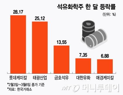 6일 한국거래소에 따르면 지난 한 달 동안(2월 3일~3월6일) 롯데케미칼은 28.17% 급등했다. 롯데케미칼은 지난 1년간 50% 넘게 하락했던 종목이다. 이 밖에도 태광산업(25.12%), 금호석유(13.55%), 애경케미칼 (7.35%), 대한유화 (6.88%)등 주요 석유화학주가 같은 기간 일제히 큰 폭으로 올랐다.