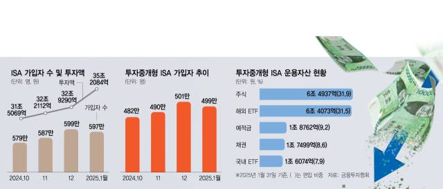 6일 금융투자협회에 따르면 올해 1월 말 기준 투자중개형 ISA 가입자 수는 499만 260명으로 전월(500만 9858명) 대비 1만 9598명 감소한 것으로 집계됐다. 2021년 처음으로 투자중개형 ISA가 도입된 이후 가입자 수가 줄어든 것은 이번이 처음이다. 이러한 영향으로 전체 가입자 수도 올해 1월 596만 7735명으로 전월보다 순감했다. 같은 기간 ISA 계좌를 통한 총 투자 금액은 35조 2084억 원으로 지난해 12월(32조 9290억 원)보다 늘었다.
