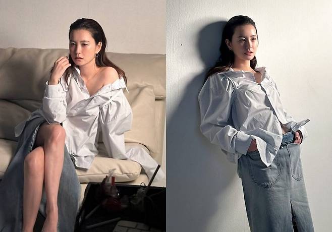 또 다른 사진에는 데님 스커트에 화이트 셔츠를 착용하고 포즈를 취하는 모습. 정유미는 40대의 나이가 믿기지 않는 여전히 아름다운 방부제 미모를 자랑하며 '윰블리' 다운 면모를 뽐냈다.